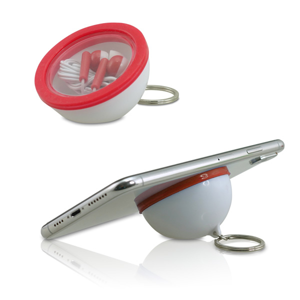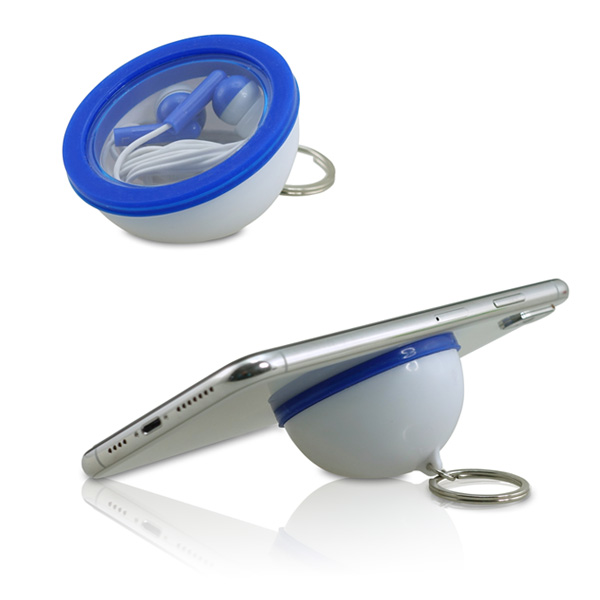 אוזניות במארז המשמש כמעמד לסמארטפון.