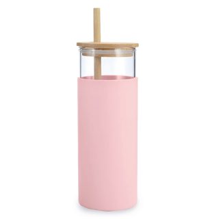 כוס זכוכית , חבק סיליקון ,עם מכסה במבוק וקש.