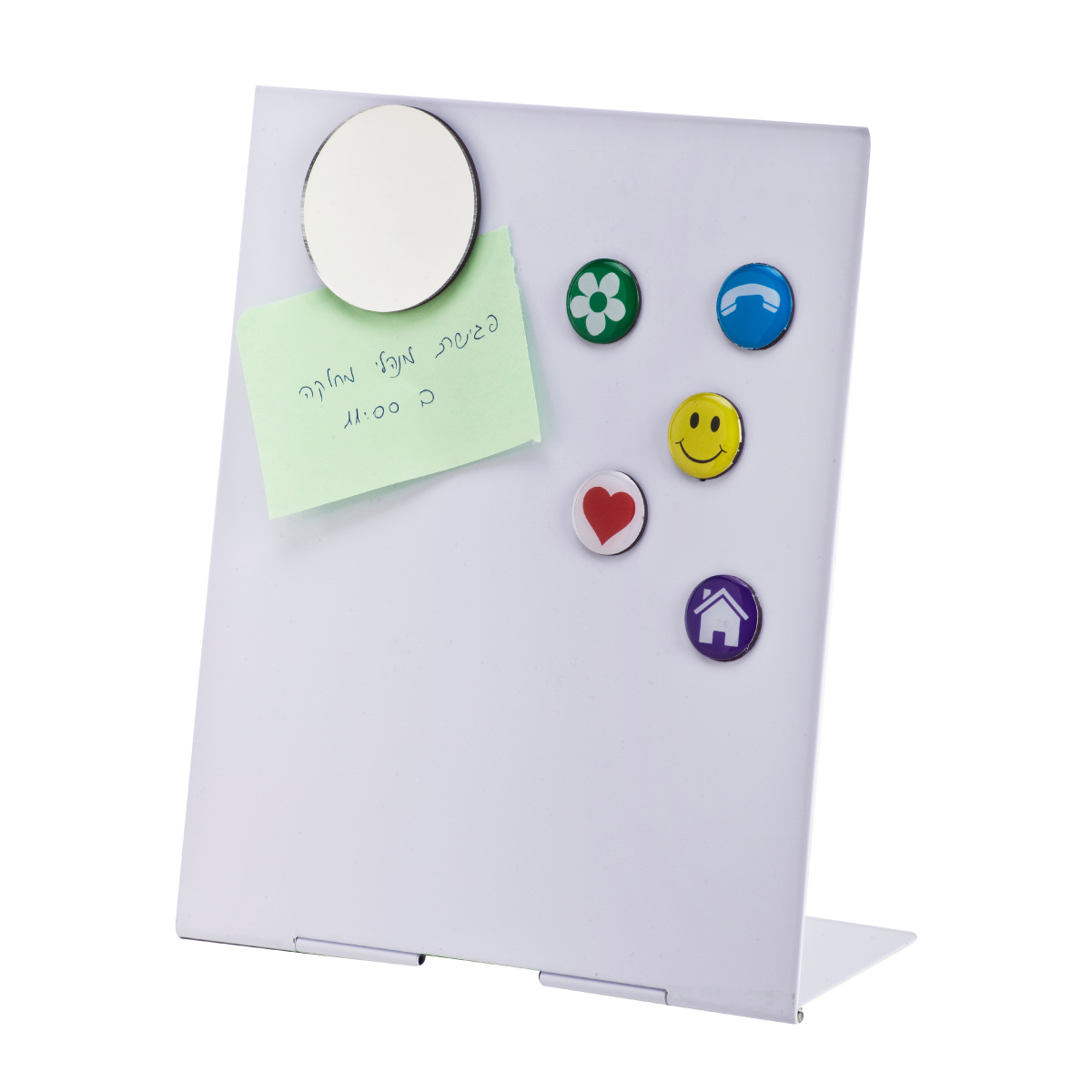 לוח מודעות שולחני עם מראה ו -5 מגנטים בעיצובים שונים, הלוח מתקפל לכדי לוח ישר לחסכון בנפח בחלוקה ללקוח, כל יחידה בקופסת מתנה.
