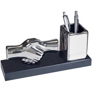 "יד לוחצת יד" מעמד שולחני עם כוס לעטים