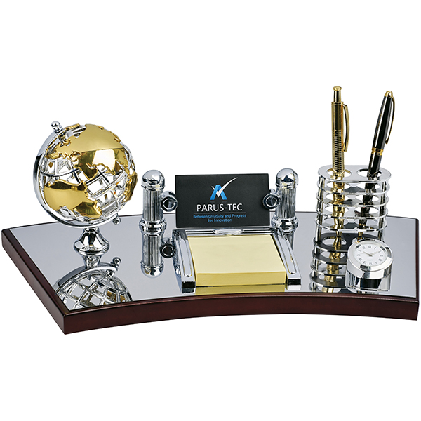 מעמד שולחני מהודר עץ ומתכת עם גלובוס, שעון