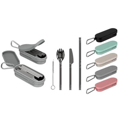 סט כלי אוכל רב פעמי: סכין, מזלג, כף, קשית וחוטר לניקוי.