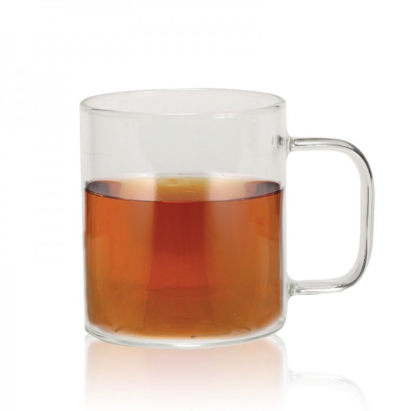 ספל זכוכית דקה עם ידית אחיזה.