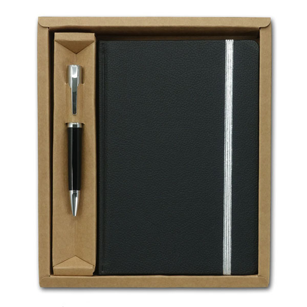 סט מפואר הכולל מחברת A5 כריכת דמוי עור קשיחה בגימור שוליים בצבע כסוף ועט מתכת כדורי יוקרתי בפתיחת סיבוב.