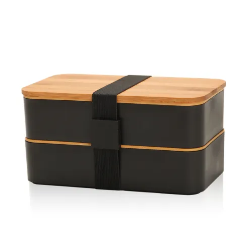 קופסת אוכל מעוצבת עם מכסה במבוק בעלת 2 קומות אחסון ומגש לסכו”ם מלא כף, מזלג וסכין 9.5X10.7X18.7 ס”מ